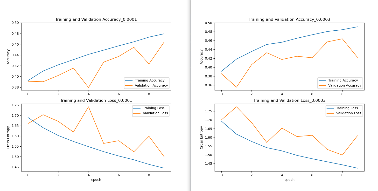 나머지.... 캡쳐실력 너무 허접하다 사실 주피터를 썼다면... 이렇지 않았겠지 0.0001~0.0003 정도에서 가장 좋은 정확도와 loss를 보이고 있는 것을 알 수 있다.