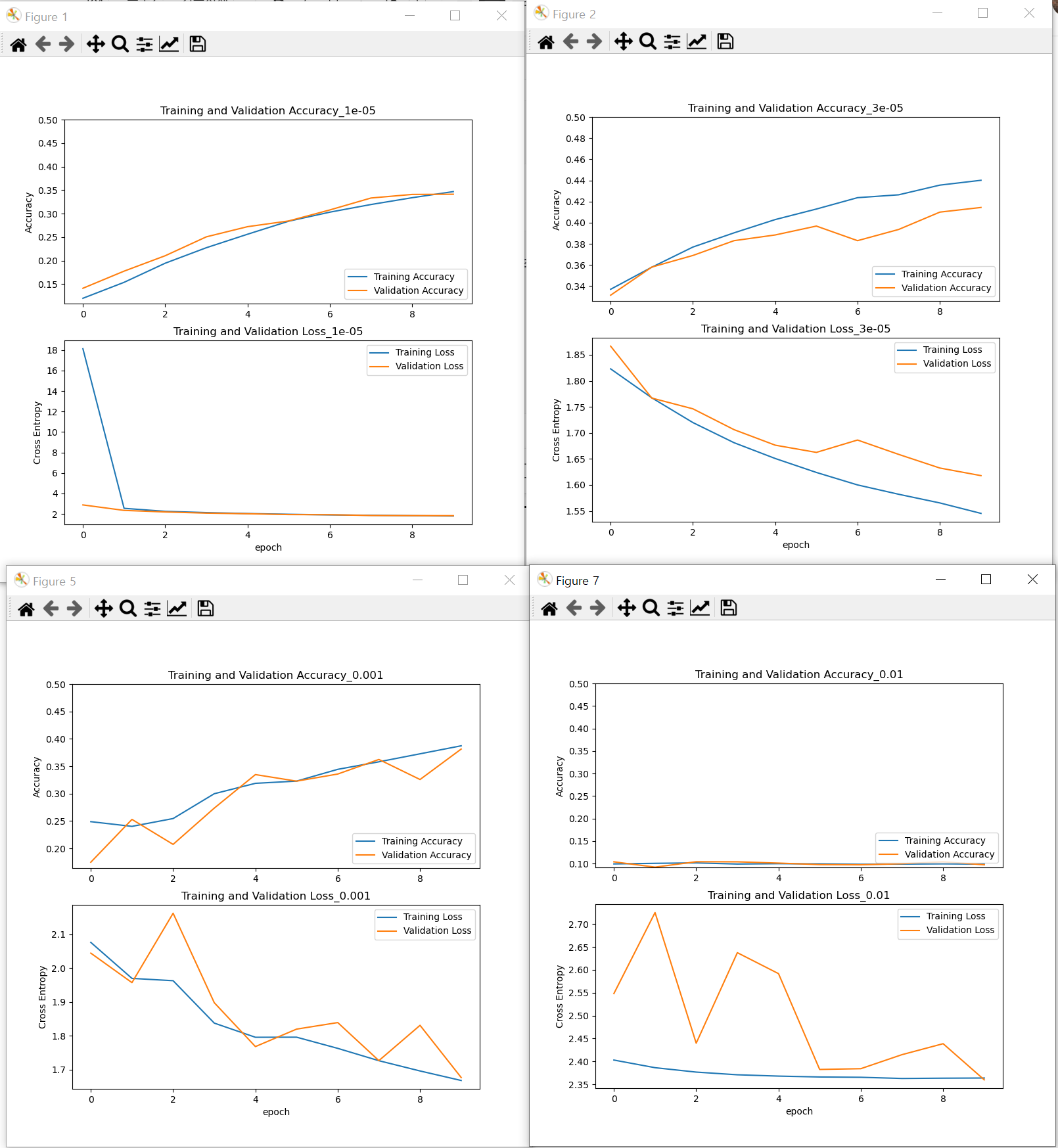 (X_train_full, y_train_full), (X_test, y_test) = cifar10.load_data() X_train = X_train_full[5000:] y_train = y_train_full[5000:] X_valid = X_train_full[:5000] y_valid = y_train_full[:5000]학습률 튜닝: [1e-5, 3e-5, 1e-4, 3e-4, 1e-3, 3e-3, 1e-2] 이중에 accuracy와 학습곡선이 제일 나은걸 찾아볼 것