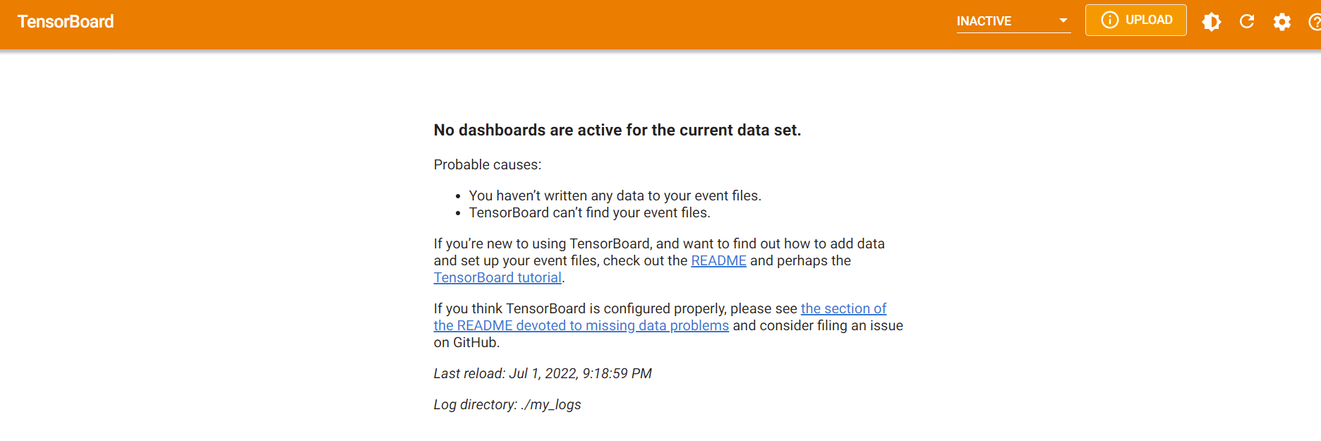 터미널 명령을 실행(가상환경 활성화, 로그 디렉터리의 상위 디렉터리에서 명령 실행) 서버가 실행되면 웹 브라우저를 열고 http://localhost:6006 으로 접속