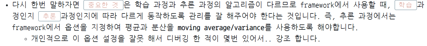 - 훈련하는 동안 배치 통계를 사용하고 훈련이 끝난 후에는 최종 통계를 사용함(이동 평균의 마지막 값)