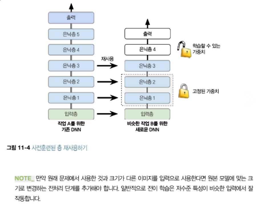 비슷한 유형의 문제를 처리한 신경망이 이미 있는지 찾고, 그 신경망의 하위층을 재사용하는 것이 좋다.