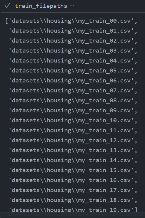def save_to_multiple_csv_files(data, name_prefix='train', header=None, n_parts=10): housing_dir = os.path.join("datasets", "housing") os.makedirs(housing_dir, exist_ok=True) path_format = os.path.join(housing_dir, "my_{}_{:02d}.csv") filepaths = [] m = len(data) for file_idx, row_indices in enumerate(np.array_split(np.arange(m), n_parts)): print(file_idx) print(row_indices) part_csv = path_format.format(name_prefix, file_idx) filepaths.append(part_csv) with open(part_csv, "wt", encoding="utf-8") as f: if header is not None: f.write(header) f.write("\n") for row_idx in row_indices: f.write(",".join([repr(col) for col in data[row_idx]])) f.write("\n") return filepaths만든 디렉토리 안에 n_parts 개의 분할된 데이터가 쌓이게 된다.