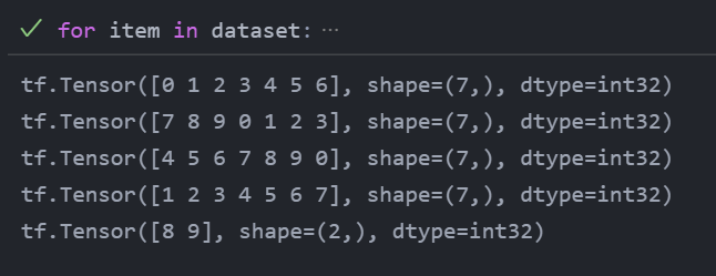 dataset=dataset.repeat(3).batch(7) for item in dataset: print(item)