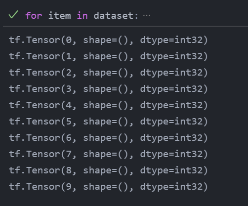 X=tf.range(10) dataset=tf.data.Dataset.from_tensor_slices(X) dataset for item in dataset: print(item)