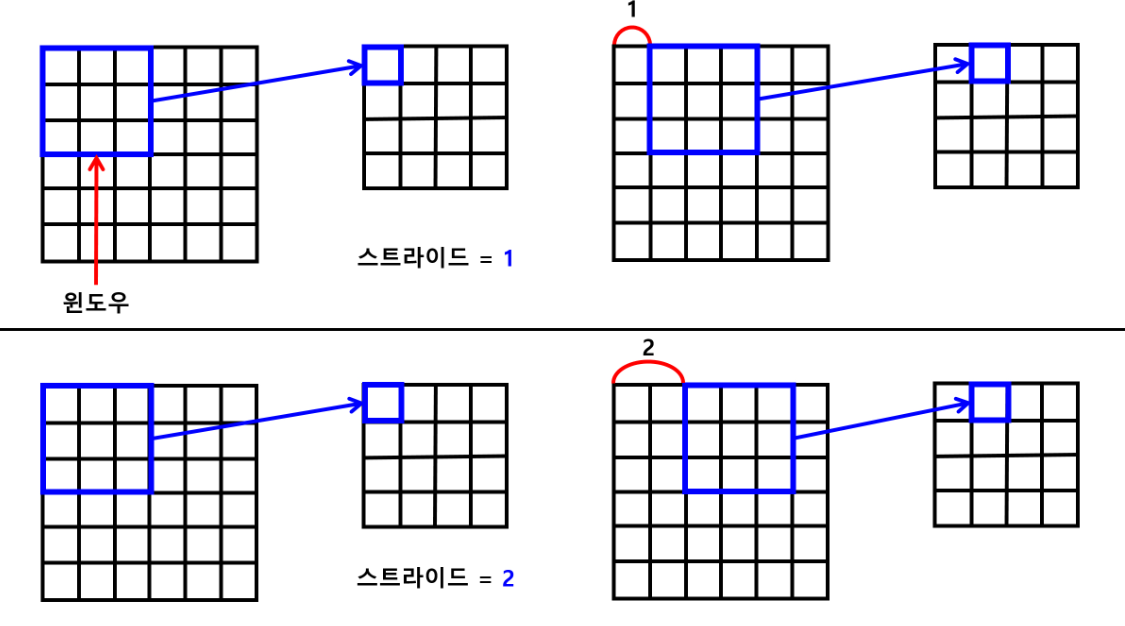 수용장 사이에 간격을 두어서 큰 입력층을 훨씬 작은 층에 연결하는 것도 가능함. 이렇게 하면 모델의 계산 복잡도를 크게 낮춰줌. 한 수용장과 다음 수용장 사이 간격을 스트라이드 라고 함.