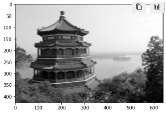 from sklearn.datasets import load_sample_images import numpy as np import tensorflow as tf import matplotlib.pyplot as plt #%% #샘플 이미지 로드 (각 픽셀 강도를 0~1 사이의 실수로 바꿈) china=load_sample_image("china.jpg")/255 flower=load_sample_image("flower.jpg")/255 images=np.array([china,flower]) batch_size,height,width,channels=images.shape #%% #필터를 두개 만듬 filters=np.zeros(shape=(7,7,channels,2),dtype=np.float32) filters[:,3,:,0]=1 #수직선 filters[3,:,:,1]=1 #수평선 outputs=tf.nn.conv2d(images,filters,strides=1,padding="SAME") #필터를 두 이미지에 적용 plt.imshow(outputs[0,:,:,1],cmap="gray") # 첫 번째 이미지의 두 번째 특성 맵을 그리기