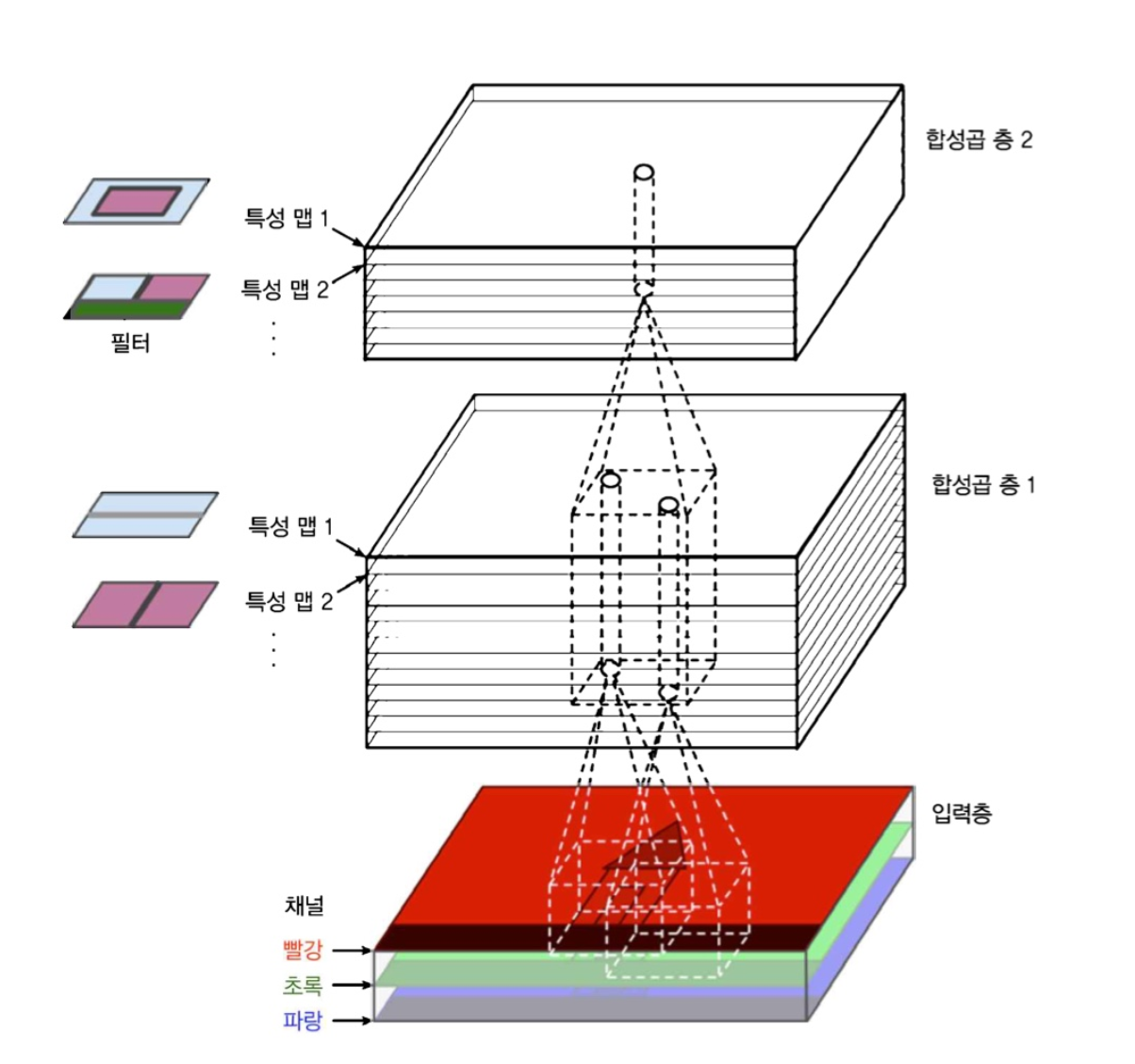 입력 이미지는 컬러채널마다 하나씩 여러 서브 층으로 구성되기도 함(RGB)
