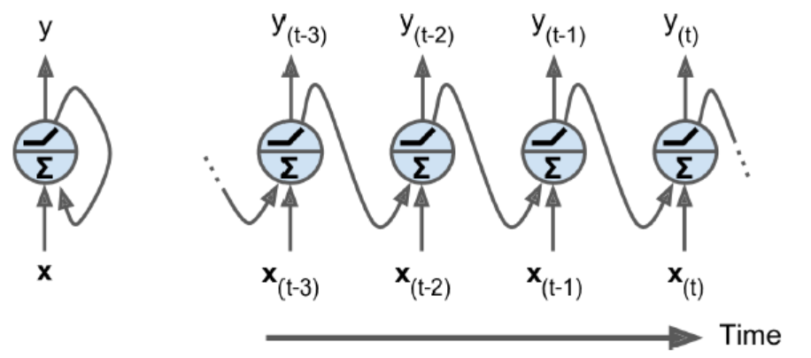 각 타임스텝 t 마다 순환 뉴런은 x(t)와 이전 타임 스텝의 출력인 y(t)를 입력으로 받음.