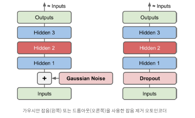 오토인코더가 유용한 특성을 학습하도록 강제하는 다른 방법은, 입력에 잡음을 추가하고 잡음이 없는 원본 입력을 복원하도록 훈련하는 것. 얀 르쿤이 석사논문에 언급했다고함... 얀르쿤 저세상 천재인듯...당연하지만....