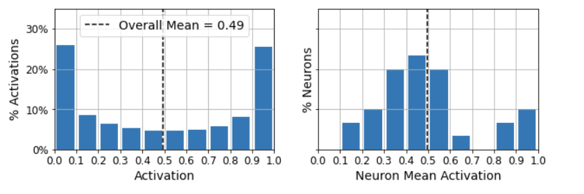 두 히스토그램은 각 뉴런이 50% 확률로 0이나 1에 가까운 값에 활성화된다는 것을 보여줍니다.