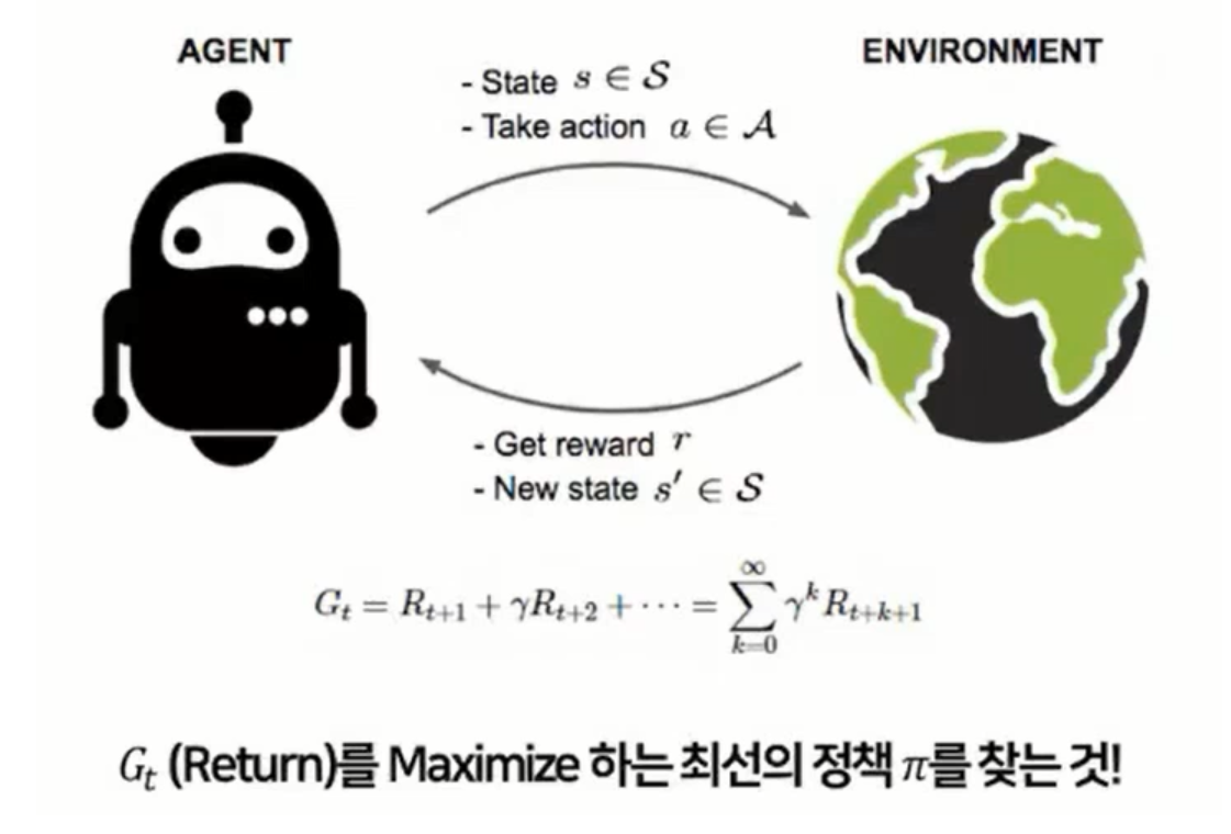 -> 간단히 에이전트는 환경 안에서 행동하고 시행착오를 겪으며 기쁨이 최대가 되고 아픔이 최소가 되도록 학습